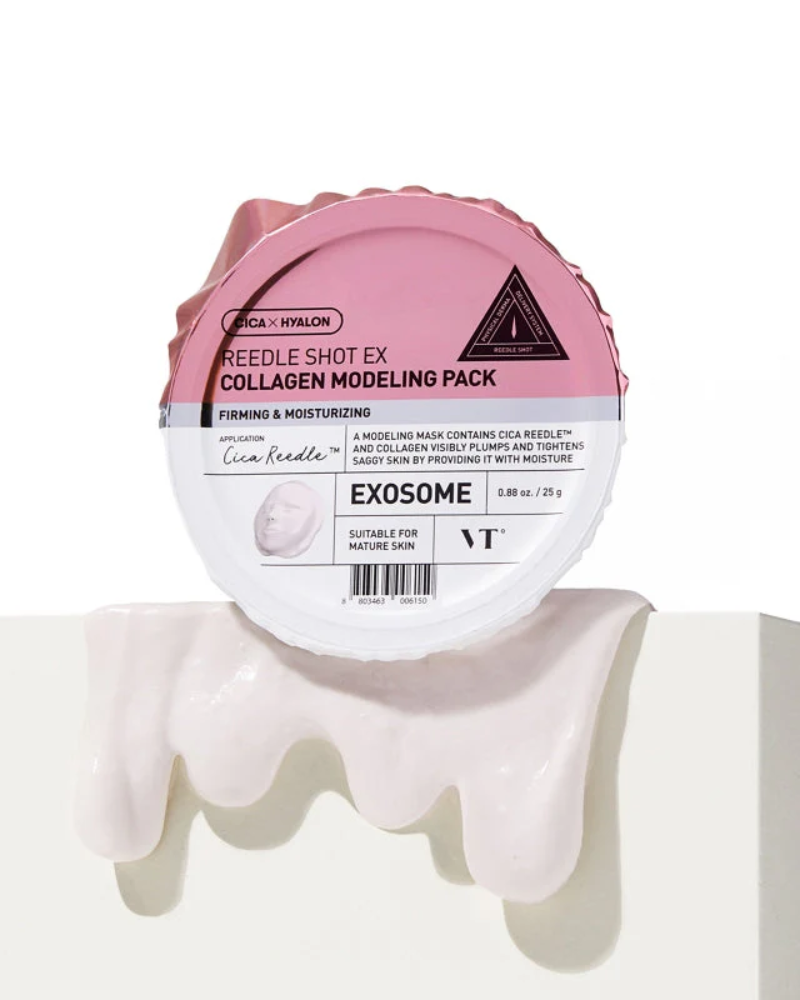 • Experience firmer, revitalized skin with the VT REEDLE SHOT EX Collagen Modeling Pack. Infused with skin-penetrating micro-needles and collagen-rich ingredients, this intensive modeling pack helps to boost elasticity, improve texture, and deliver visible firmness. The innovative “reedle” (needle-like silica particles) technology gently stimulates the skin’s surface to enhance absorption, promoting a youthful and radiant glow after just one use.